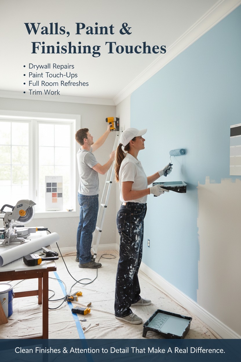 We take care of the cosmetic details that keep your home looking its best. From drywall repairs and paint touch-ups to full room refreshes and trim work, we focus on clean finishes and attention to detail that make a real difference.